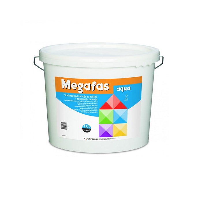 CHROMOS bijela fasadna boja Megafas aqua, ekonomična fasadna boja izrađena na osnovu vodene disperzije. Za zaštitu vanjskih i unutrašnjih zidova stambenih i javnih zgrada. Jednostavno se nanosi na sve podloge. Odlične pokrivne moci i parapropusnosti,otporna na vanske uticaje.Pakovanje: 15 L