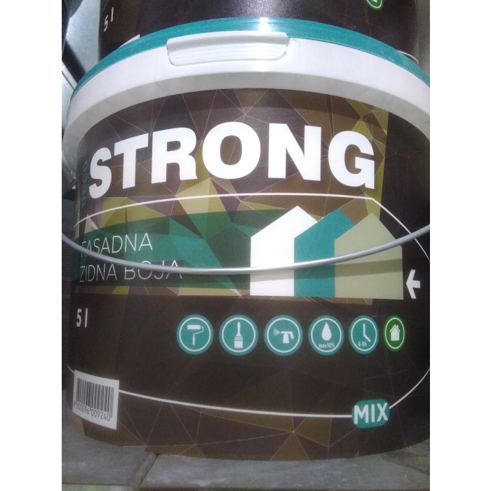 DECO STRONG fasadna boja 8kg je ekonomična boja na osnovi vodene disperzije akrilatnog sastava za zaštitu i dekoraciju vanjskih zidova, fasada i unutarnjih zidova. Paropropusna je,otporna na atmosferske uticaje. Proizvodi se u bijeloj boji te se može tonirati u pastelnim tonovima.