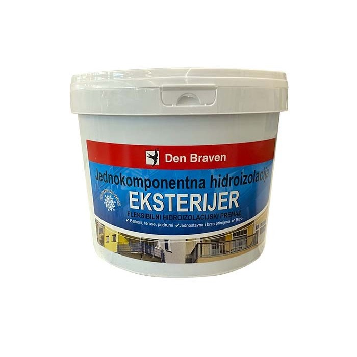 DEN BRAVEN premaz za hidroizolaciju exterijer 5kg je jednokomponentni, polutečni premazi tiksotropnih svojstava na bazi polimerne disperzije. Nakon sušenja, premaz postaje visoko elastičan, čvrst, vodootporan i otporan na mraz sa odličnim prianjanjem na površinu. Pruža vodootporni premaz ispod keramičkih podova i zidnih pločica za unutrašnju i vanjsku upotrebu: balkone, terase, lođe, kupaonice, toalete, tuš kabine, podrume, kuhinje, praonice rublja.Težina: 5 kg