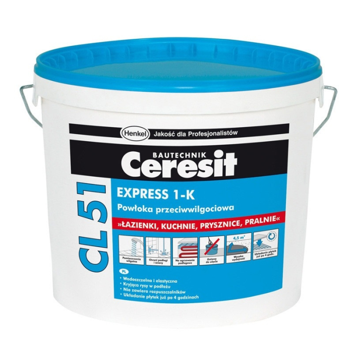 CERESIT premaz za hidroizolaciju 1K CL51 15kg jednokomponentni fleksibilni premaz za zaptivanje bez spojnica ispod keramičkih pločica u vlažnim i mokrim uslovima (kupatila, tuš kabine, kuhinje, javni toaleti i slično). Samo za unutrašnju upotrebu.