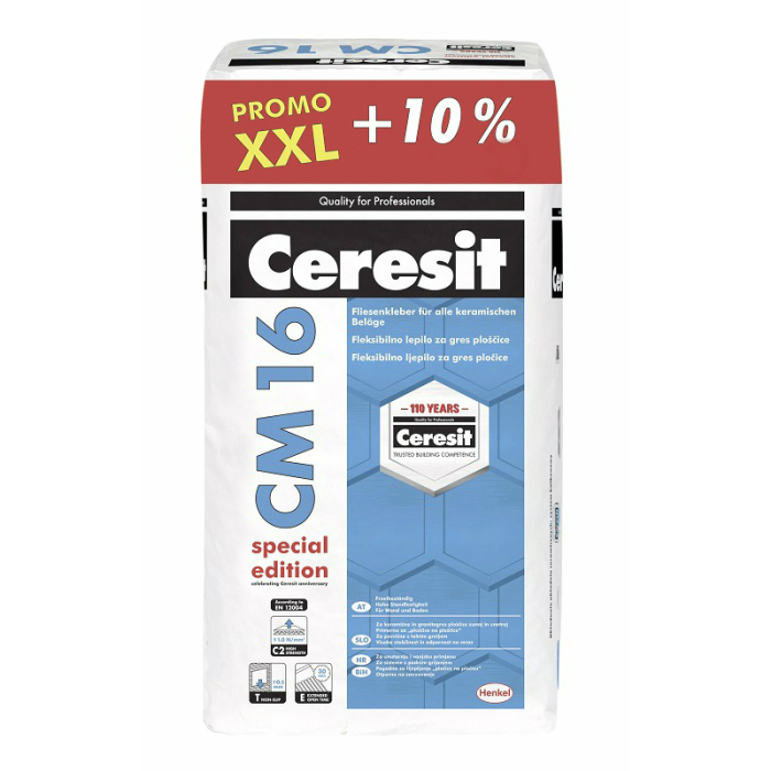 CERESIT ljepilo keramičko CM 16 je tankoslojno fleksibilno ljepilo za polaganje kermičkih pločica i obloga na kritične podloge. Ljepilo osigurava fleksibilan ljepljivi spoj i izbjegava unutrašnji lom na kritičnim podlogama. Za UNUTRAŠNJU i VANJSKU upotrebu.