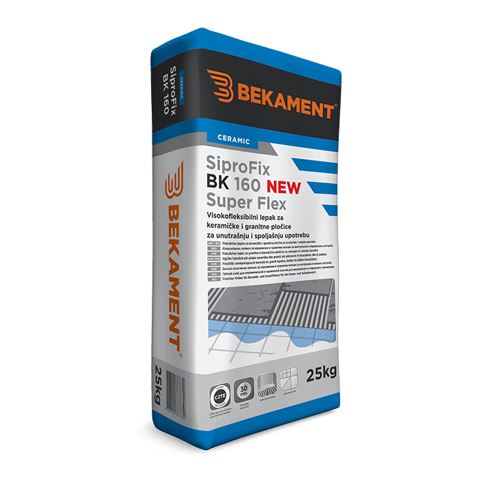 BEKAMENT ljepilo keramičko SiproFix BK 160 služi za ljepljenje keram. pločica, mozaika, mermera, granita, prirodnog i vještač. kamena na zidne, podne i fasadne površine, isključivo na čvrste podloge. Odlična prionljivost, visoka čvrstoća, fleksibilnost i otpornost. Za UNUTRAŠNJU i VANJSKU upotrebu.