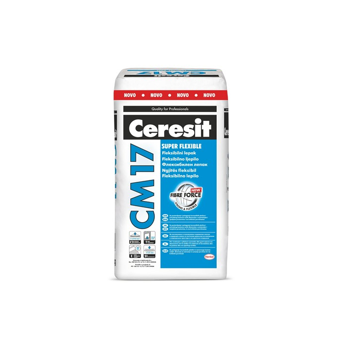 CERESIT ljepilo keramičko CM 17 je nova poboljšana formulacija s Fibre Force tehnologijom donosi vidljiva silikatna vlakna koja ljepilu daju veću snagu lijepljenja i finalnu čvrstoću! Vrlo fleksibilno ljepilo za lijepljenje keramičkih pločica na kritične podloge.Za UNUTRAŠNJU i VANJSKU upotrebu.