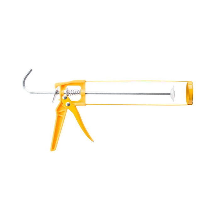 Pištolj za silikon skelet se sastoji od magacina, klipa, drške, poluge okidača i konusnog vrha.Kada se okidač pritisne, klip se pomjeri , što generiše proces stiskanja mase koja se nalazi u magacinu.Profilisani vrh oslobađa malu količinu materijala i omogućava njegovu preciznu primjenu.Težina: o,41kg