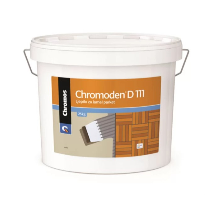 CHROMOS ljepilo za lamelne parkete Chromoden D 111 je jednokomponentno ljepilo izrađeno na bazi polivinilacetatne vodene disperzije, punila i aditiva za lijepljenje lamel i klasičnog parketa manjih dimenzija na upijajuće podloge. Brušenje nakon 7 dana. Otvoreno vrijeme 25- 30min.