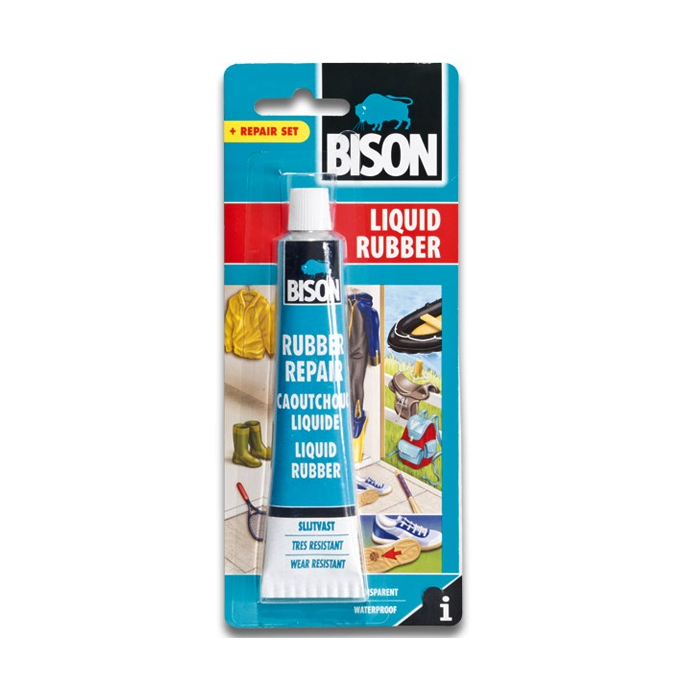 BISON ljepilo za gumu 50ml popunjavanje rupa i brtvljenje gume, kože, tekstila, neoprena, raznih vrsta sintetike (npr. Hypalon®), drva, metala ili keramike. Također prikladno za popravak cipela i tenisica (đonova i peta), čizmi, rukavica, papuča, (hokejskih) palica, predmeta na napuhavanje.