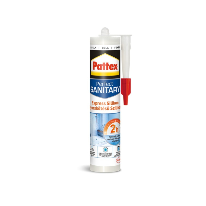 PATTEX Express silikon sanitarni je namijenjen za keramičke pločice, plastiku (npr. PMMA), staklo, aluminij i druge. Voda može doći u kontakt sa silikonom već nakon 2 sata, pa je prikladno za vrlo vlažne prostore. Vrlo otporan na promjenu boje, vruću vodu, UV zrake i ekstremne temperature.