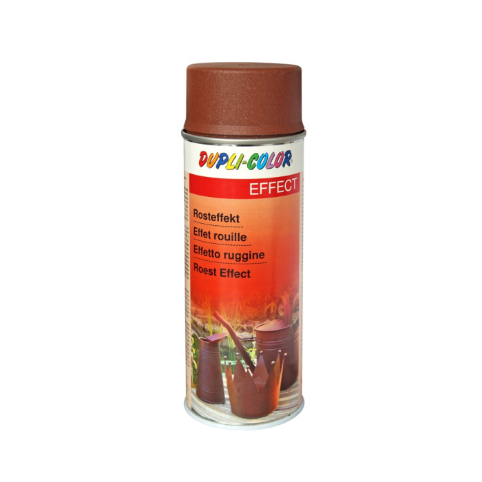DUPLI-COLOR sprej efekt hrđe 400 ml je boja u spreju koja stvara realistično imitaciju hrđe na različitim površinama. Idealno je za kreativne projekte, dekoraciju ili stvaranje rustičnog, industrijskog izgleda na metalima, plastici i drvetu. Pakovanje od 400 ml omogućava jednostavno nanošenje i postizanje efekta stare, oksidirane hrđe, koji je savršen za vintage ili steampunk stilove.
