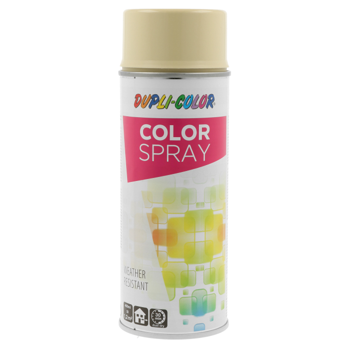 DUPLI-COLOR sprej krem 1014 je visokokvalitetna sintetička smola. Može se koristiti na raznim površinama poput drveta, metala, stakla, kamena, keramike, raznih vrsta plastike, tapeta i platna. Otporan je na ogrebotine i udarce. Vrijeme sušenja u idealnim atmosferskim uslovima je 30 minuta.