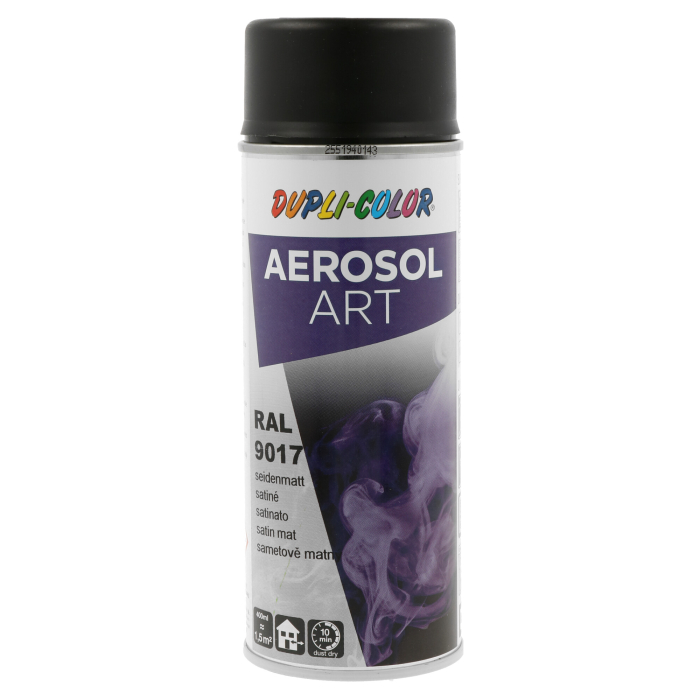 DUPLI-COLOR sprej Aerosol Art RAL 9017 je akrilna boja u spreju, dugotrajne postojanosti i velike otpornosti na ogrebotine. Može se koristiti na materijalima kao što su drvo, metal, papir, staklo, neka plastika, tekstil, beton, kamen. Primjena u unutrašnjim i vanjskim uslovima.