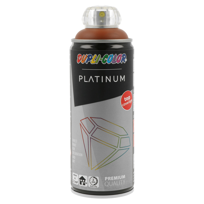 DUPLI-COLOR sprej Platinum terakota je svilenkasta, izuzetno brzosušeća, visokokvalitetna specijalna boja sa veoma širokim spektrom primjene. Zavisno od boje, ima do dvostruko veću pokrivnost od konvencionalnog spreja. Ima veliku površinsku tvrdoću. Primjena unutra i vani.