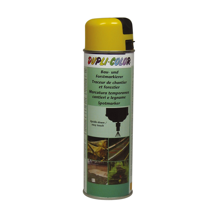 DUPLI-COLOR sprej za obilježavanje trupaca žuti 500ml za građevinarstvo i šumarstvo za privremeno označavanje na gradilištima, visokogradnji i niskogradnji, gradilištima i izgradnji puteva. Takođe se može koristiti u tunelu i rudarstvu. Posebno pogodan u šumarstvu i drvnoj industriji.