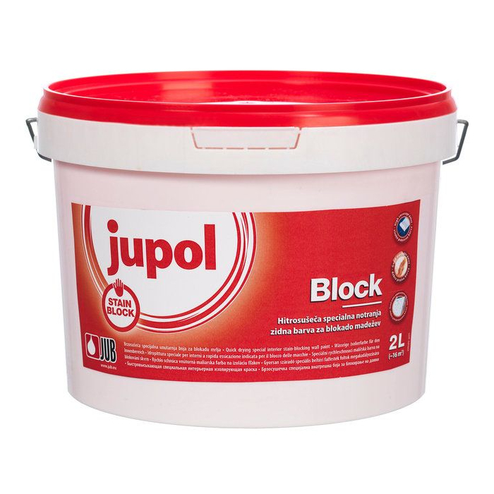 JUB blokator mrlja 5l je specijalna brzosušeća boja za blokadu mrlja. Namijenjena je za korištenje u unutarnjim prostorima za obnavljanje i bojenje svih vrsta zidova i plafona. Učinkovito blokira mrlje od nikotina, katrana i drugih derivata duvanskog dima. Blokira i mrlje od vina, sokova, kafe.