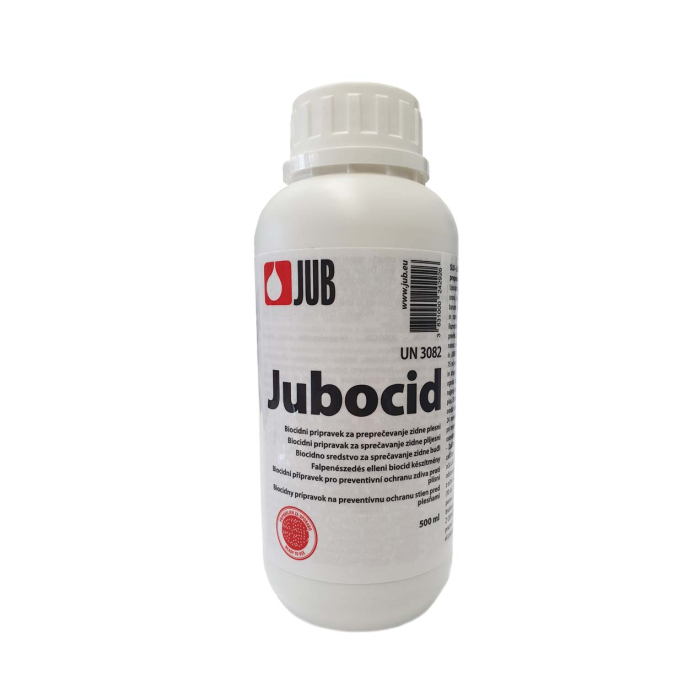 JUB jubocid 0,5l je bezbojna fungicidna otopina, koja se dodaje unutarnjim zidnim disperzijskim bojama (JUPOL, JUPOL BRILJANT, JUPOL GOLD, JUPOL LATEKS) učinkovito sprečava odnosno zaustavlja rast i razvoj većine najraširenijih zidnih plijesni i drugih mikroorganizama.