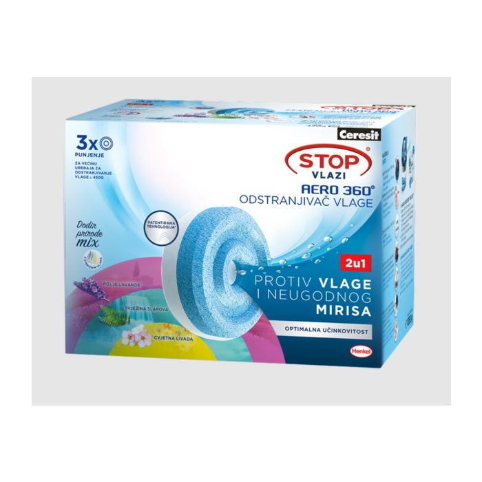 CERESIT odstranjivač vlage Aero Scents Mix 3X450g spruža snažnu i dugotrajnu kontrolu vlage u domu. Set sadrži tri punjenja koja efikasno upijaju vlagu i pomažu u sprječavanju kondenzacije, plijesni i neugodnih mirisa. Pogodan je za sve AERO uređaje i idealan za kupatila, podrume, kuhinje i ostale slabo provjetrene prostore. Granule postepeno pretvaraju vlagu u tečnost, a jednostavna zamjena osigurava stalno svjež i ugodan ambijent.