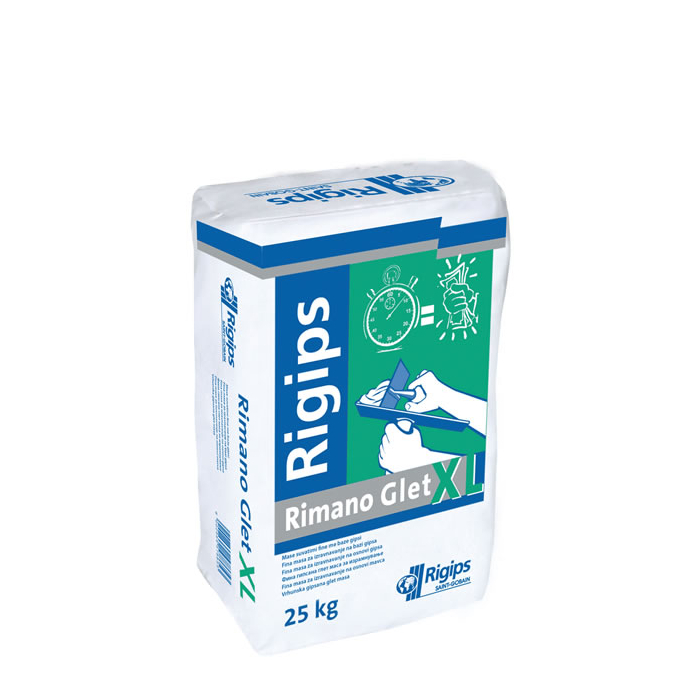 RIGIPS SAINT-GOBAIN glet masa Rimano xl, je glet masa koja: ravna 0-10 mm u jednom sloj, može se ugrađivati mokro na mokro. Za ispunjavanje i krpljenje manjih neravnina na zidovima i stropovima. Lagana za ugradnju, flexsibilana, velike brzine sušanja.Pakovanje 25kg.