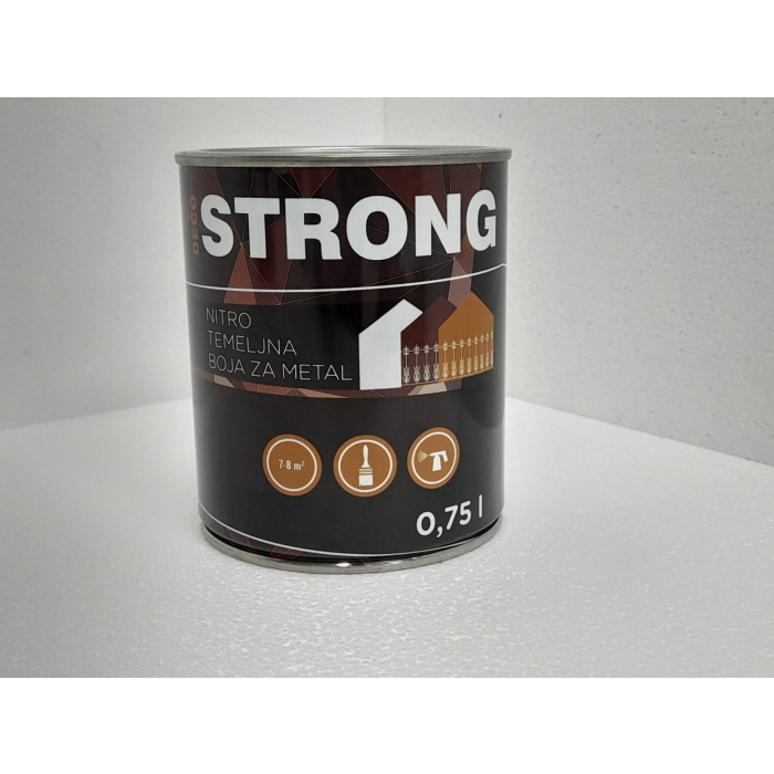 DECO STRONG boja za metal siva, temeljna je jednokomponentni osnovni premaz na bazi sintetičkih smola, nitroceluloze, antikorozivnih pigmenata, aditiva i rastvarača. Namijenjena je za antikorozivnu zaštitu metalnih površina od gvožđa i čelika, u enterijeru i eksterijeru. Odlikuje se brzim sušenjem dobrom adhezijom i antikorozivnim svojstvima. Sa 1 litrom može se premazati 10m2 u jednom sloju. Nanosi se četkom ili špricanjem u 1-2 sloja. Sušenje između premaza je 10-15 minuta.Težina: 0,75 l