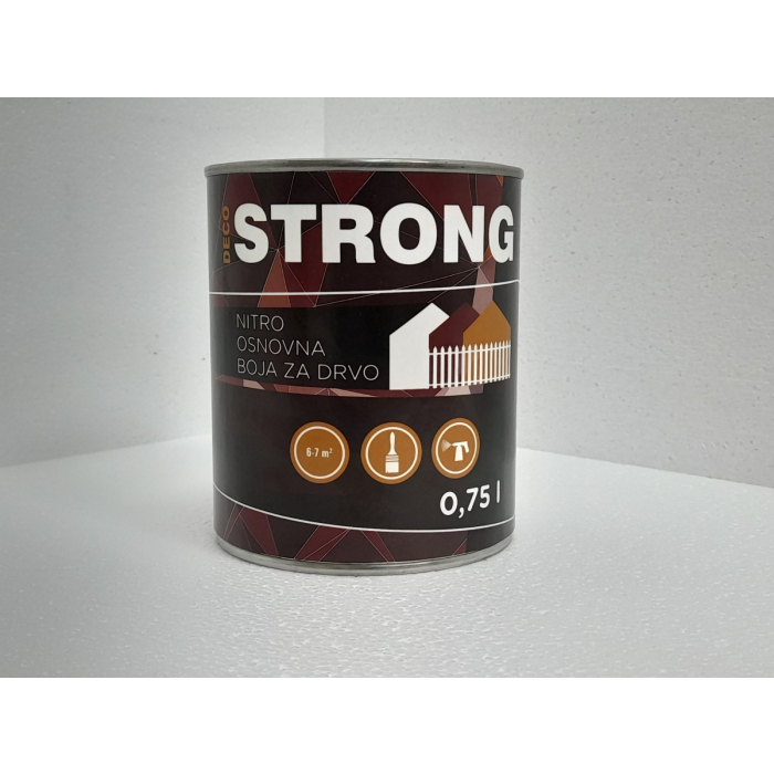 DECO STRONG boja za drvo bijela, osnovni premaz na bazi sintetičkih smola, nitro celuloze, neorganskih pigmenata, aditiva i rastvarača. Namijenjena je za osnovnu zaštitu drvenih površina u interijeru. Odlikuje se brzim sušenjem i pokrivanjem podloge.Pakovanje: 0,75l