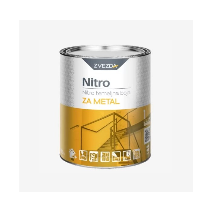 ZVEZDA nitro temeljna boja siva 5l osnovni antikorozivni premaz za zaštitu metala u enterijeru i eksterijeru. Osobine i upotreba: glavna karakteristika ovog premaza je brzo sušenje koje skraćuje vreme potrebno za rad. Premaz sadrži kvalitetne antikorozivne pigmente.
