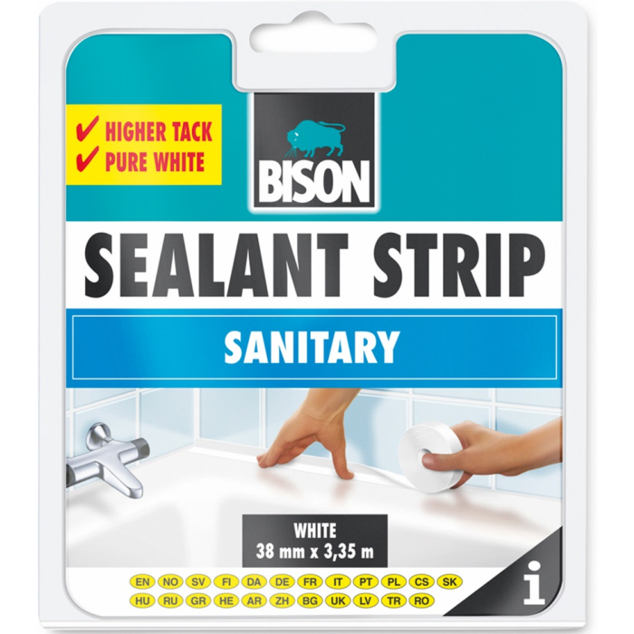 BISON traka sanitarna 38mmx3.35m samoljepljiva zaptivna traka za trajno uređenje vodonepropusnih spojeva duž kupatila, tuš kabine i poda. Lako se nanosi. Za uređenje, vodootporno, dekorativno zaptivanje spojeva duž kupatila, tuš kabina, umivaonika i poda.