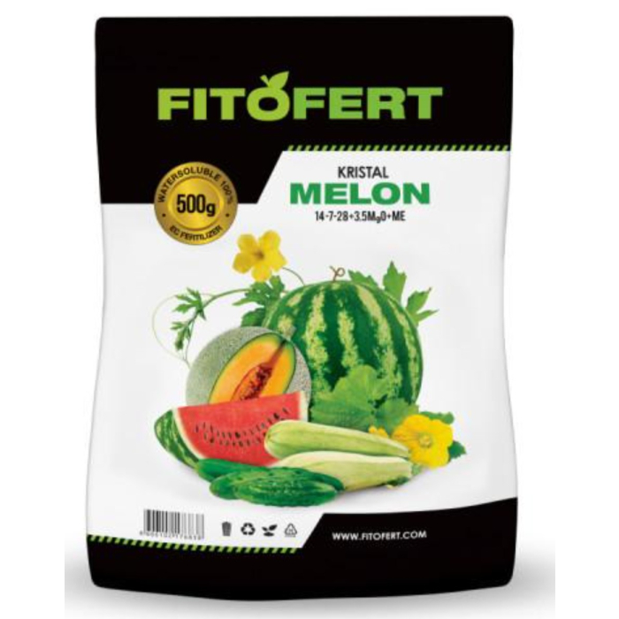 FITOFERT 23 đubrivo Kristal Melon 14:7:28 500g je vodotopivo mineralno đubrivo namijenjeno za prihranu biljaka u fazi formiranja i razvoja plodova. NPK formula 14:7:28 obezbjeđuje veći sadržaj kalijuma za bolji kvalitet, veličinu i slatkoću plodova, uz uravnotežen rast biljke. Brzo se rastvara i lako primjenjuje zalivanjem ili fertirigacijom. Idealno je za povrće, voće i plasteničku proizvodnju.