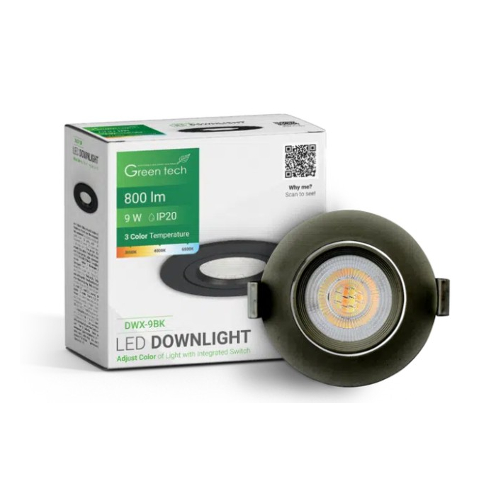GREEN TECH svjetiljka Downlight 9W/3000+4000+6500K crna 800Lm, moderna LED svjetiljka sa izborom tri temperature svjetla (3CCT) za prilagođavanje ambijentu. Snage 9W i svjetlosnog toka 800 lm pruža jako i ravnomjerno osvjetljenje. Crni dizajn daje elegantan izgled, a ugradna izvedba omogućava diskretnu montažu. Idealna za stambene i poslovne prostore.