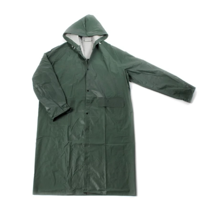 KABANICA kišna XXL zelena savršena je za kišne dane. Izrađena od dvoslojnog PVC sloja sa podstavom od pamuka i polestera. Vodootporna kabanica sa ušivenim i zalijepljenim šavovima. Opremljena sa dva vanjska džepa i kapuljačom koja se dobro zakopčava zahvaljujući kanapi.