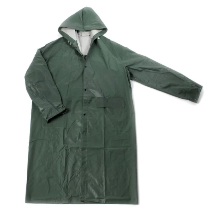 KABANICA kišna XXXL zelena savršena je za kišne dane. Izrađena od dvoslojnog PVC sloja sa podstavom od pamuka i polestera. Vodootporna kabanica sa ušivenim i zalijepljenim šavovima. Opremljena sa dva vanjska džepa i kapuljačom koja se dobro zakopčava zahvaljujući kanapi.