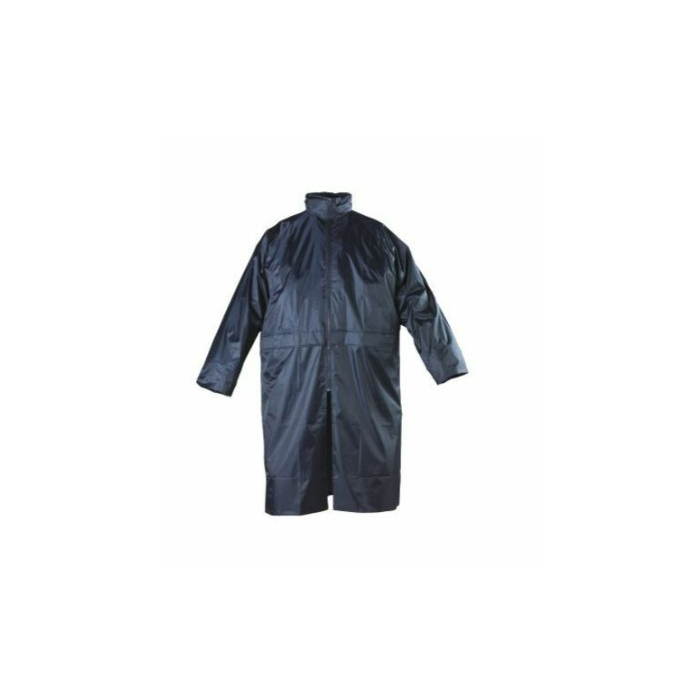 KABANICA kišna XL plava osigurava dodatnu zaštitu od vremenskih uslova. Izrađena od poliamida sa PVC slojem, vodootporna. Kapuljača u zatvorenoj kragni sa vezicom. Patentni zatvarač i preklop sa dugmadima. Dva vanjska dzepa.