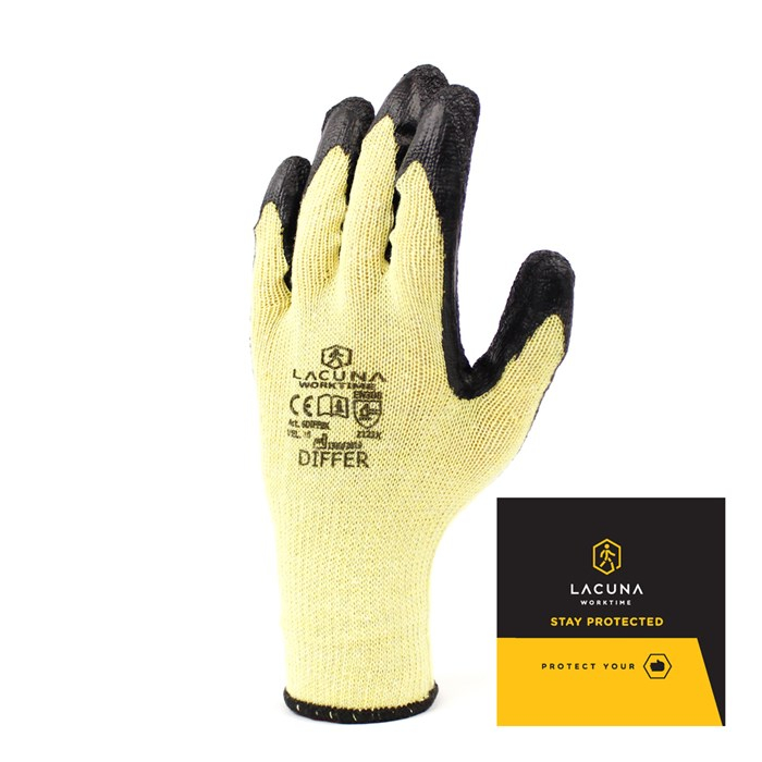RUKAVICA Differ crna vel. 10 - poliester podloge sa premazom od lateksa i elastičnom manžetom za precizne radove. Materijal poliester. Premaz crni lateks preko dlana. Norme EN420, EN388.