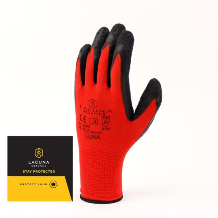 RUKAVICA poliamidna crvena Luna - pletene podloge s lateks premazom i elastičnom manžetom za precizne radove. Materijal crveno najlon pletivo. Premaz crni od lateksa preko dlana.Norme EN420, EN388.