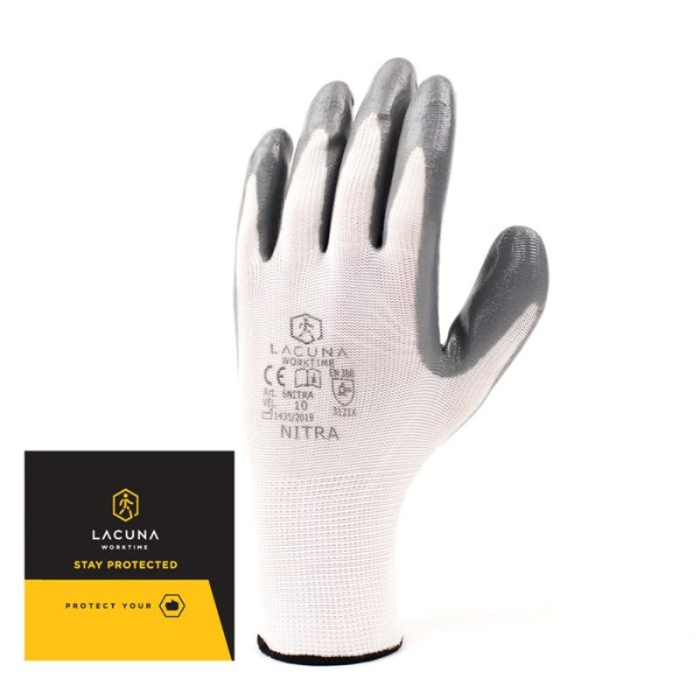 RUKAVICA sa nitrilnim premazom Nitra vel. 10 je elastična rukavica koja je umočena u nitril preko dlana te na vrhovima prstiju. Standard EN420, EN388 ( 3121X ).
