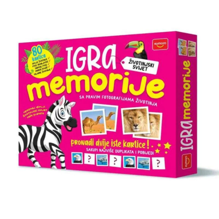 IGRA memorije divlje životinje je edukativna društvena igra namijenjena djeci za razvoj pamćenja i koncentracije. Igra se sastoji od kartica sa slikama životinja koje se okreću i uparuju, a cilj je pronaći što više istih parova. Podstiče logičko razmišljanje, pažnju i učenje o životinjama kroz zabavu. Pogodna je za igru u porodici ili društvu, za djecu različitog uzrasta.