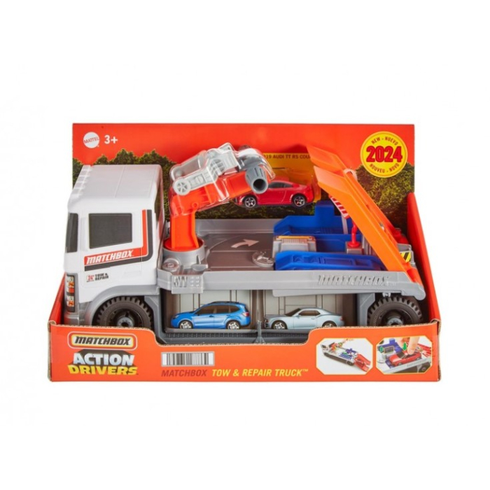 IGRAČKA kamion vučna služba pruža djeci uzbudljivu igru spašavanja na putu. Uz kamion dolazi Audi TT RS Coupe 1:64, koji se može zakačiti na kuku i odvesti do dijagnostičkog uređaja okretanjem dugmeta. Auto se zatim podiže na dizalicu radi pregleda, a nakon „popravke“ pumpaju se gume i igra se nastavlja. Set je kompatibilan s drugim Matchbox Action Drivers setovima. Idealno za maštovitu igru i male ljubitelje vozila.