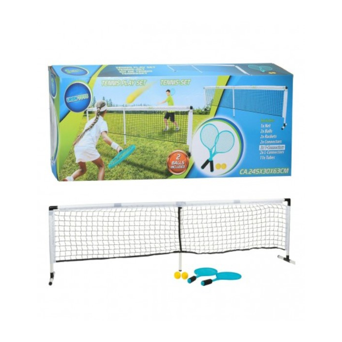 SET za tenis dimenzija 245x15x64 cm uključuje sve što je potrebno za zabavnu i uzbudljivu igru. Set obuhvata rekete, loptice i mrežu, pružajući djeci priliku da uživaju u mini teniskim mečevima. Idealno je za dvorište ili park, pomažući djeci u razvoju koordinacije i timskog duha.
