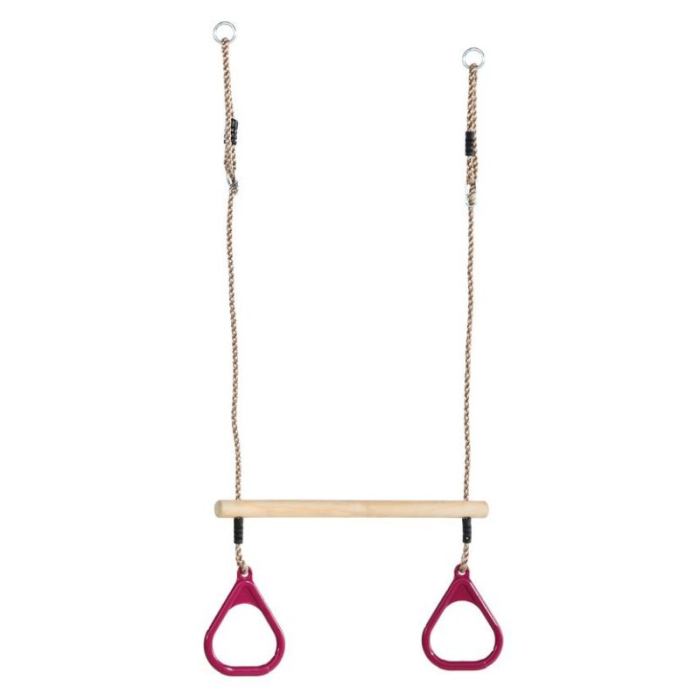 KBT trapez sa krugovima viseća šina s plastičnom ručkom pogodna za djecu od 3 do 12 godina. Prečka je ovješena na prirodnom užetu, nadopunjenom bravama za uže za podešavanje visine. Veličina šipke: 58cm Veličina ručke: 16,5, v.21cm.