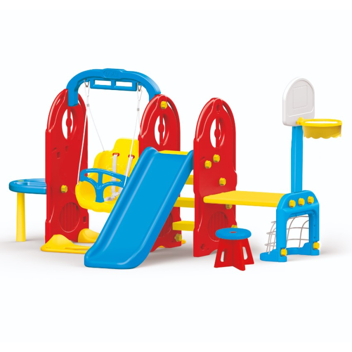 DOLU tobogan 7 u 1 ima snažan i robustan dizajn koji ovaj set čini savršenim za smještaj više od 1 djeteta. Vaši mališani mogu uživati u igralištu 7 u 1 odjednom - igrajući se s košarkaškim obručem, fudbalskim golom, toboganom, stolom za igranje u pijesku i vodi, ljuljačkom, stolom s stolčicom ili jednostavnim otkopčavanjem ljuljačke dijete može koristiti šipka za povlačenje. Jednostavan za sastavljanje/instalaciju i pogodan za djecu stariju od 2 godine.Dimenzije: 124 x 250 x 150 cm