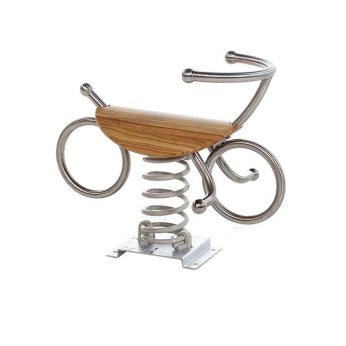 KBT klackalica na oprugu - biciklo, ručke i oslonci za noge izrađeni su od nehrđajućeg čelika, a sjedala i ploče od drva ariša. Drvo i opruga isporučuju se nesastavljeni. Velika opruga ima zavojnicu prečnika 18 mm, promjer 170 i visinu 410 mm. Plosnato sidro mora biti pričvršćeno vijcima na beton. Anker je izrađen od vruće pocinčanog čelika. Uključeni su odgovarajući plastični poklopci i svi potrebni dijelovi za montažu.Dimenzije: 900 x 480 x 700 mmPotreban prostor: 2,49 x 3,50 m