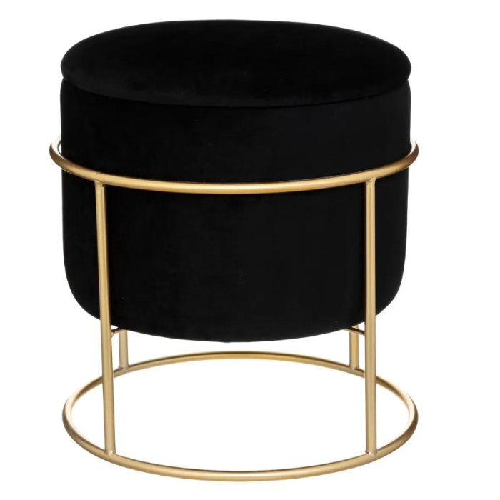 ATMOSPHERA tabure Eliane crni na zlatnom postolju, je veoma modernog dizajna. Savršeno će se prilagoditi Vašem dekoru. Ovaj tabure je 2u1, jer sadrži i skladišni dio koji se nalazi ispod sjedećeg dijela.Dimenzije: 44x42x42cm.