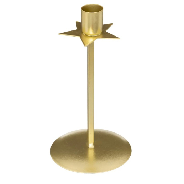 ATMOSPHERA svijećnjak metalna zvijezda 18cm, predstavlja klasični svijećnjak za dugu svijeću. Izrađen od metala zlatne boje. Ima ukrasnu zvijezdu. Izuzetno elegantan i minimalistički.Dimenzije: 18 x 9 x 9 cm (v x š x d)Materijal: MetalBoja: Zlatna