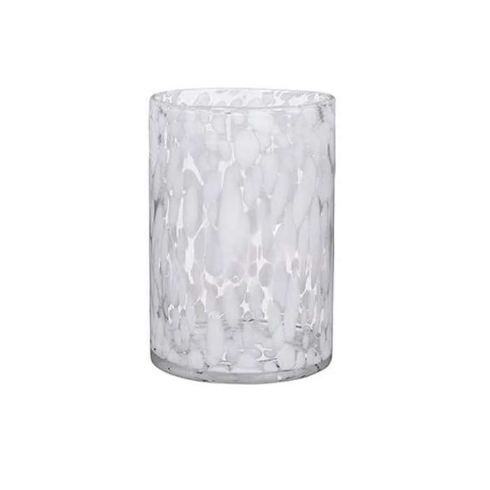 Jednostavna ukrasna staklena vaza. Oblikovana je u cilindričnom obliku te ukrašena bijelim šarama. Jednostavnog je ali elegantnog izgleda te se lijepo uklapa u svaku prostoriju gdje god da je postavite.