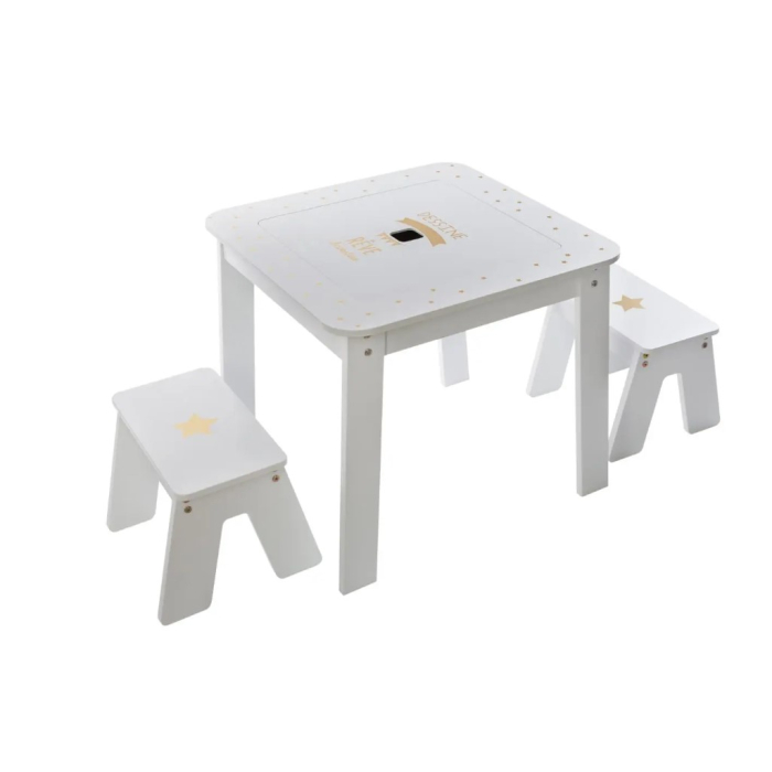 Stol sa dvije stolice je savršen element opremanja dječje sobe! Da li vaše dijete voli provoditi vrijeme razvijajući kreativne igre? U prostoriju postavite sto za koji će sjediti na stolici pričvršćenoj za garnituru, a zatim može crtati, slikati ili raditi vizualne radove drugim tehnikama. Ovaj jedinstveni komad namještaja ima gornji dio koji se može ukloniti koji se pretvara u stol za pisanje kredom i praktičan prostor za odlaganje pribora za pisanje unutra. Stol u univerzalno bijeloj boji izrađen je od kombinacije medijapana i punog drveta. U kompletu su i dvije tabure, zahvaljujući kojima će se Vaše dijete igrati sa prijateljem. Ploča stola i sjedište stolice bili su prekriveni ukrasnim uzorkom sivih zvijezda.
