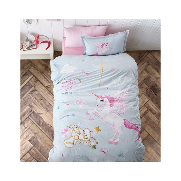 POSTELJINA dječija Pegasus 160 x 220 cm, kvalitetno izrađena posteljina za dječiji krevet. Napravljena je od čistog pamuka, koji je nježan na dodir i omogućava koži da nesmetano diše, čineći spavanje ugodnijim. Izrađena u svjetlo plavoj boji i ukrašena motivom jednoroga sa krilima.Dimenzije: 160 x 220 cmMaterijal: 100% pamukPaket uključuje:1 x navlaka za poplun: 160 x 220 cm1 x posteljina: 180 x 240 cm1 x Jastučnica: 50 x 70 cm
