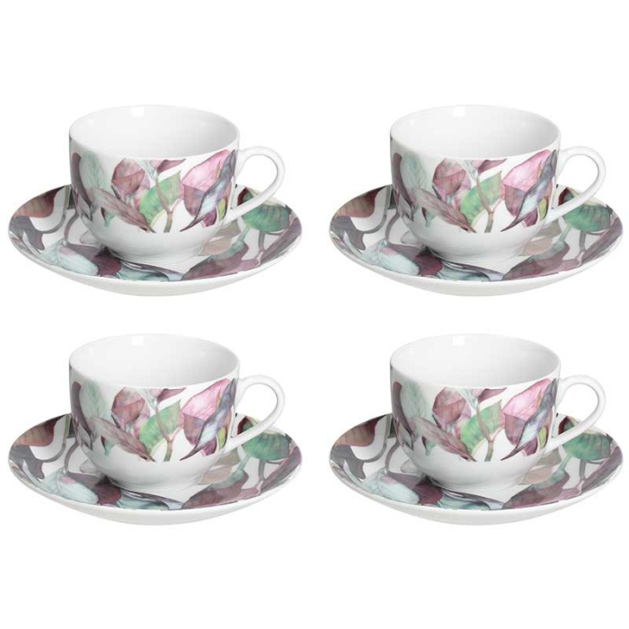 TOGNANA set izrađen je od finog porculana i sastoji se od 4 šolje i 4 tanjira ukrašena cvjetnim ukrasima u nijansama ružičaste, ljubičaste i bordo. Besprijekoran za elegantan i otmjen odmor.
