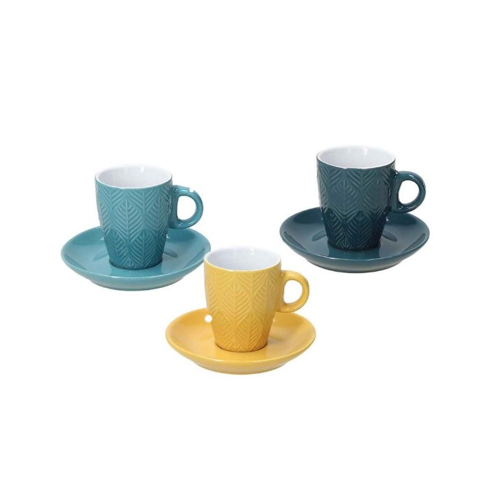 TOGNANA šolje sa tanjirićima za kafu Maya, tropski trend je obavezan na današnjem stolu i uključuje svijetle boje u žutoj, plavoj i zelenoj nijansi. Ove šolje u tri različite boje imaju reljefne ukrase koji podsjećaju na Južnu Ameriku. Šolje su idealne za moderan stol punog boja i osobnosti. Zapremina šolje: 90mlSet sadrži šest šolja.