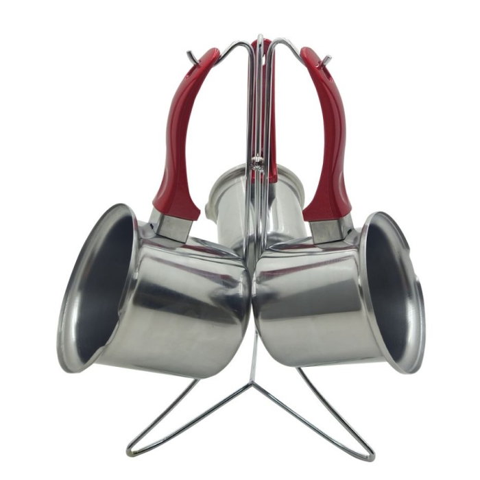 DŽEZVE trend na stalku je set koji uključuje tri džezve različitih veličina postavljene na praktičan stalak, što omogućava lakše odlaganje i uštedu prostora. Set je izrađen od kvalitetnih materijala, poput aluminijuma ili inoxa, koji obezbjeđuju ravnomjerno zagrijavanje za pripremu savršene kafe. Moderan dizajn ovog seta čini ga estetskim dodatkom svakoj kuhinji, pružajući funkcionalnost i stil u pripremi omiljenog napitka.