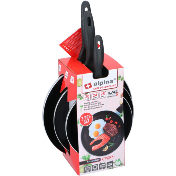 ALPINA set tava je praktičan set koji sadrži tri tave različitih veličina, savršene za različite vrste kuharskih zadataka. Set uključuje tave prečnika 20 cm, 24 cm i 28 cm, što omogućava pripremu manjih i većih porcija hrane. Svaka tava je opremljena neprianjajućim premazom, što olakšava kuhanje i čišćenje, a njena čvrsta konstrukcija obezbjeđuje ravnomjerno zagrijavanje, čineći kuhanje bržim i efikasnijim. Idealne su za upotrebu na svim vrstama šporeta, uključujući indukcione ploče.