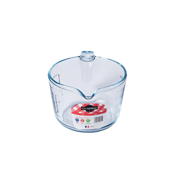 ÔCUISINE bokal stakleni za mjerenje sa poklopcem 1 l - nudi visokokvalitetne kuhinjske proizvode koji mogu pomoći svima u njegovoj kuhinji. Staklena mjerna čaša izrađena je od kaljenog borosilikatnog stakla, što je garancija kvaliteta. Zahvaljujući materijalu, može se prati u mašini za suđe.