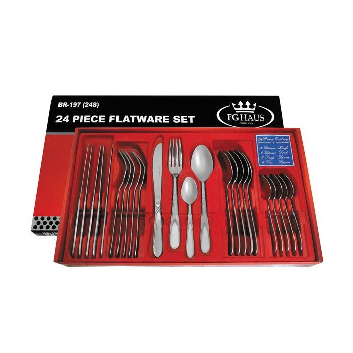 Set escajga FG 24/1 BR-197 je set za šest osoba, napravljen od dugotrajnog i praktičnog nerđajućeg čelika, sa srebrnim aplikacijama, blagih i zaobljenih linija.U ovaj set ulazi:6 velikih kašika,6 malih kašika,6 velikih viljuški,6 noževa nazubljenih sa jedne strane.