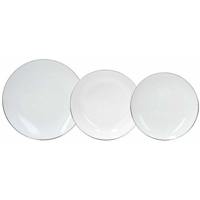 TANJIRI set Tognana Metropol Fascetta 18/1 sa srebrnim rubom, za 6 osoba, porculanski set od 18 komada. Set se sastoji od 6x plitki tanjir (fi 27 cm), 6x duboki tanjir (fi 21 cm), 6x desertni tanjir (fi 20 cm). Pogodan za pranje u mašini za suđe i za mikrotalasnu pećnicu.